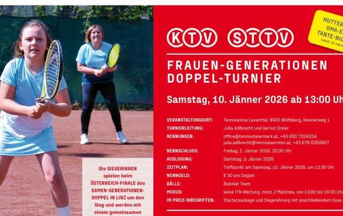 Im Zuge der Kärntner Landesmeisterschaften findet am 10. Jänner 2026 ab 13:00 Uhr ein Damen Generationen Doppelturnier statt.
