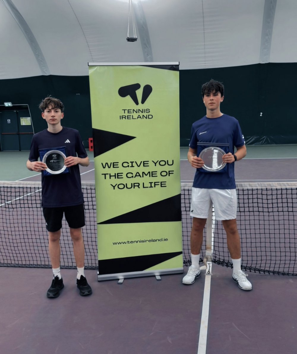 Bei der Siegerehrung des ITF-J30-Turniers in Dublin von links nach rechts: 2. Moritz Freitag, 1. Patrick Breen.