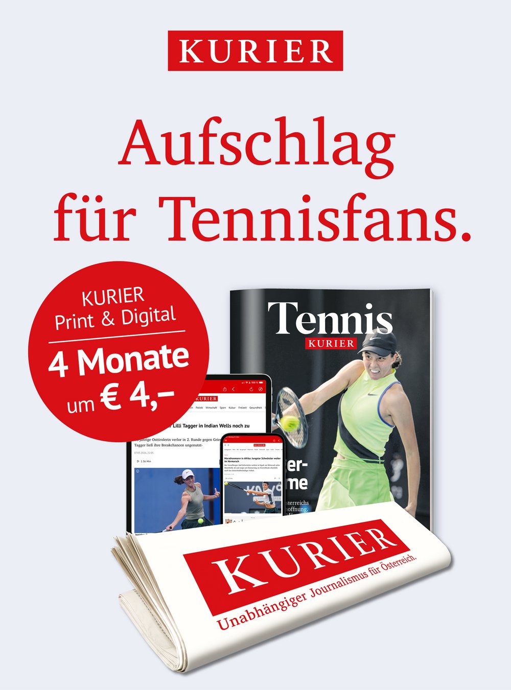 Wer noch tiefer in die Welt des Tennissports eintauchen möchte, sollte sich das KURIER-Tennismagazin am 25. März 2026 nicht entgehen lassen. Hole dir noch heute den KURIER 4 Wochen lang um nur € 4,- als Kombi aus Print & Digital und sichere dir damit neben faktenbasierter Berichterstattung und gut recherchiertem Journalismus auch das Tennisspecial. Wer dieses Abo noch am heutigen 22. März abschließt, erhält das KURIER-Tennismagazin am 25. März ins Haus geliefert.